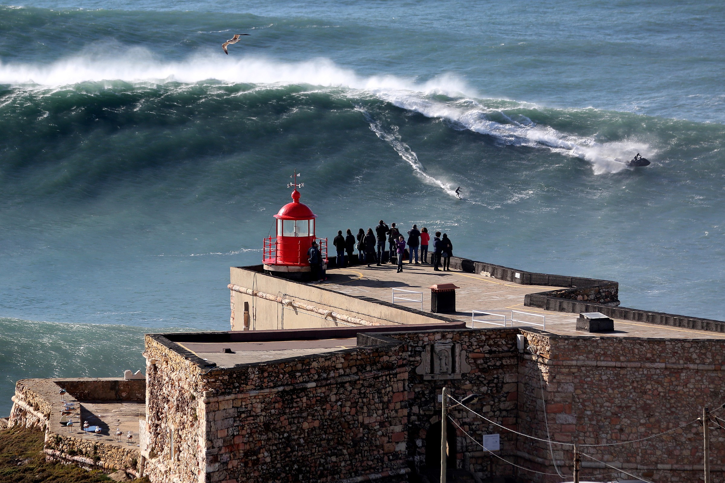 Constitui um miradouro privilegiado sobre as ondas da Praia do Norte.